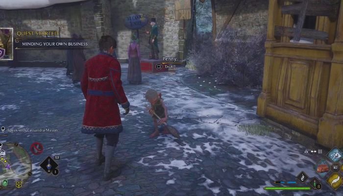 Para comenzar esta aventura inolvidable, primero debes completar la misión principal de la historia titulada Fuego y viceversa. Una vez desbloqueada, dirígete a Hogsmeade, donde encontrarás a Penny, una elfa doméstica que te espera frente a una tienda vacía. Al hablar con ella, iniciará una cadena de eventos que te llevará a conocer a Cassandra Mason, la dueña de la tienda.